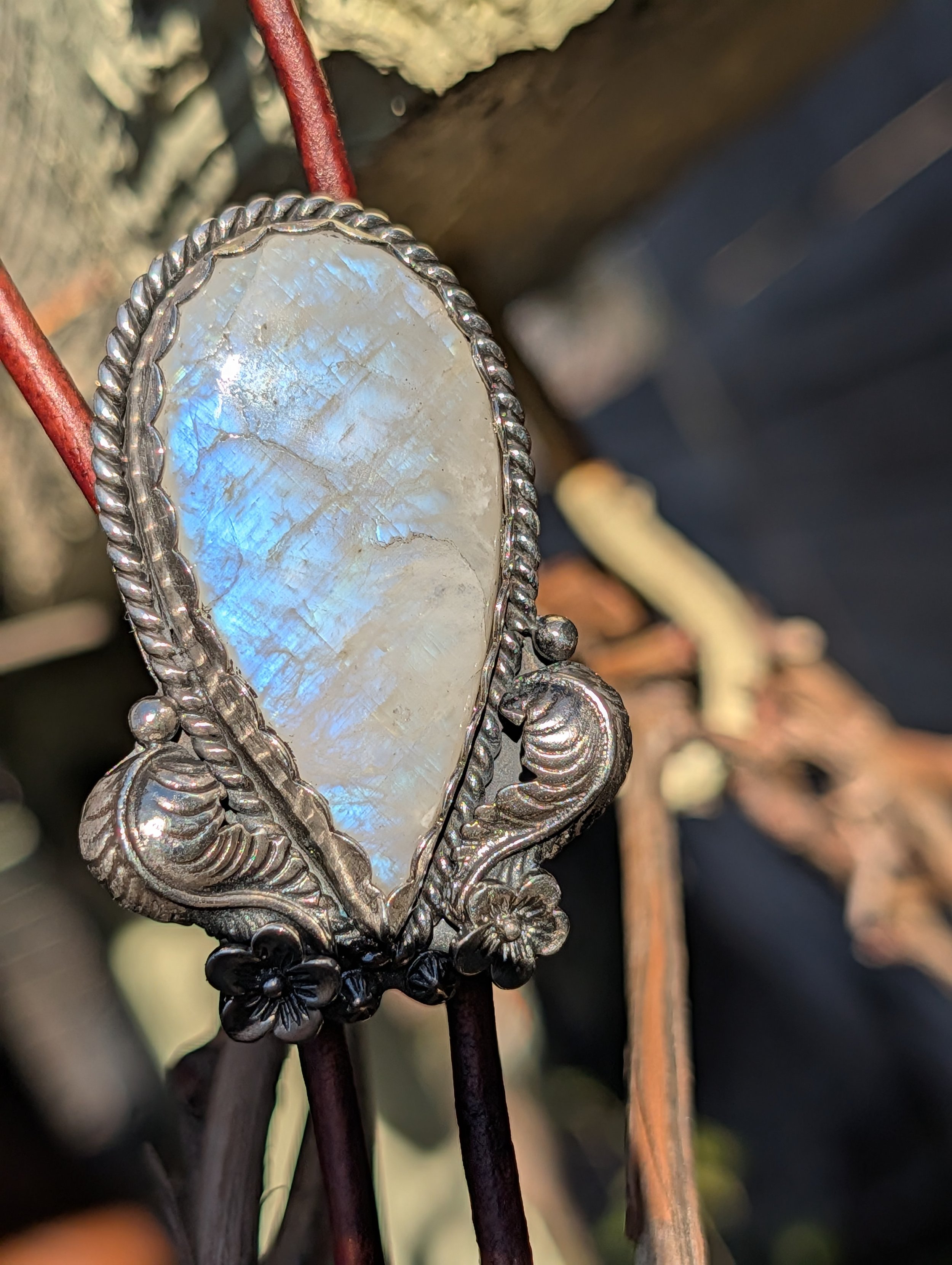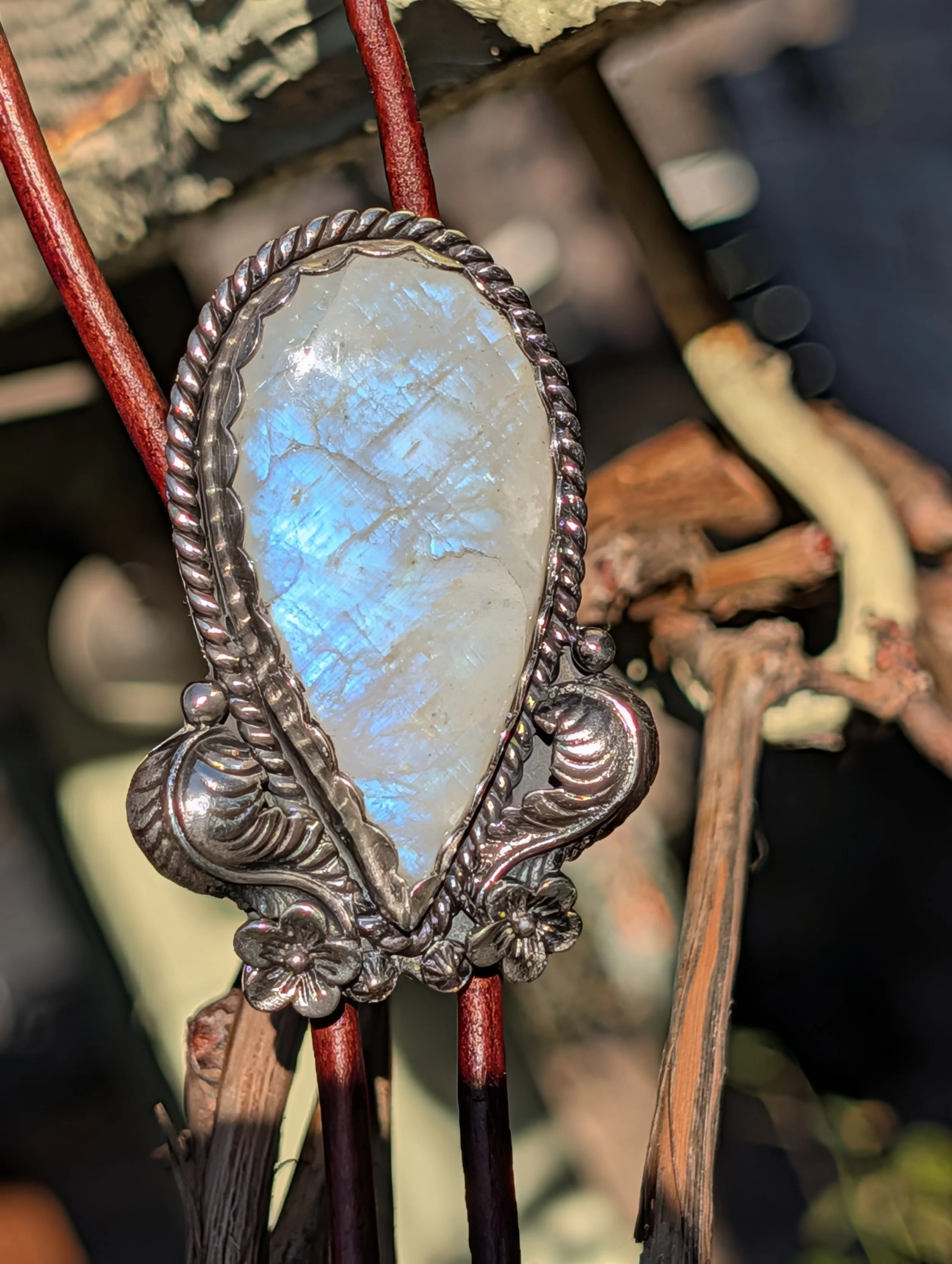 This one-of-a-kind bolo tie centers around a luminous, natural moonstone, hand-set in solid sterling silver. The stone flashes with soft blue fire as it moves in the light—an effect moonstone is treasured for—bringing a quiet but unmistakable presence to the piece.